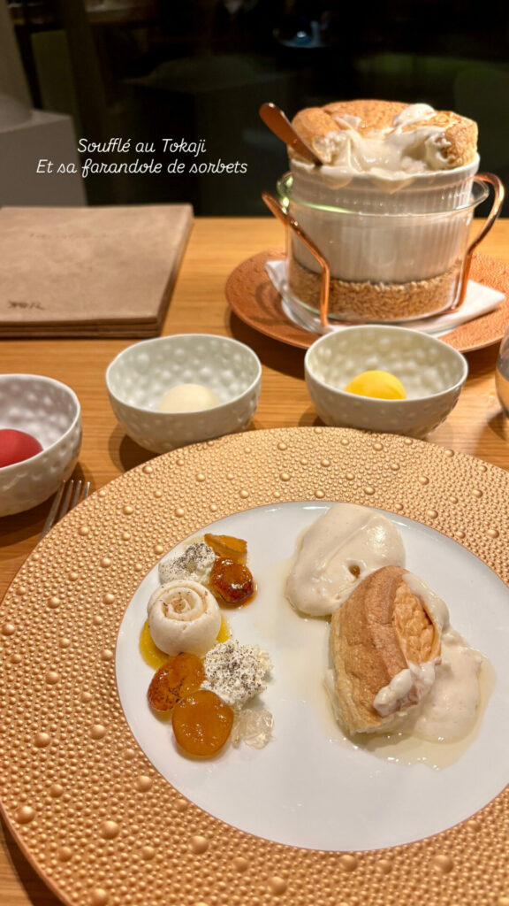 Soufflé au Tokaji – Vanille, prunes, glace miel et Tonka – Mousse fontainebleau, gelée de Tokaji
